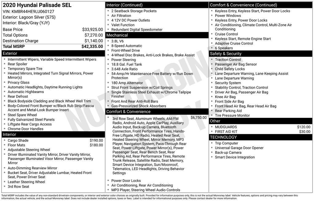 115-Volt AC Power Outlet, 3.648 Axle Ratio, 3rd row seats: split-bench, 3rd Row USB Outlets, 4-Wheel Disc Brakes, 6 Speakers, 7 High Resolution Cluster Display, 8-Passenger Bench Seating P4, 8-Way Power Adjustable Passenger Seat, ABS brakes, Air Conditioning, Alloy wheels, AM/FM radio, Apple CarPlay & Android Auto, Artificial Leather-Wrapped Dashboard, Auto High-beam Headlights, Auto Leveling Rear Suspension, Auto-dimming Rear-View mirror, Automatic temperature control, Bi-LED Headlights, Brake assist, Bumpers: body-color, Cargo Cover/Screen, Carpeted Floor Mats, Convenience Package P2, Delay-off headlights, Driver door bin, Driver vanity mirror, Dual front impact airbags, Dual front side impact airbags, Electronic Stability Control, First Aid Kit, Four wheel independent suspension, Front anti-roll bar, Front Bucket Seats, Front Center Armrest, Front dual zone A/C, Front reading lights, Fully automatic headlights, Garage door transmitter: HomeLink, Hands-Free Smart Liftgate w/Auto Open, Heated 2nd Row Seats, Heated door mirrors, Heated Front Bucket Seats, Heated front seats, Heated Steering Wheel, Illuminated entry, Integrated Memory System, Knee airbag, Leather Seat Trim, LED Taillights, Low tire pressure warning, Mudguards, Occupant sensing airbag, Outside temperature display, Overhead airbag, Overhead console, Panic alarm, Parking Distance Warning - Forward, Passenger door bin, Passenger vanity mirror, Power 3rd Row Seating, Power door mirrors, Power driver seat, Power steering, Power Sunroof P5, Power windows, Premium & Drive Guidance & 8-Seat, Premium Package P3, Radio data system, Radio: AM/FM/MP3 Display Audio, Radio: AM/FM/MP3 Premium Audio System, Rear air conditioning, Rear anti-roll bar, Rear Side Window Sunshades, Rear window defroster, Rear window wiper, Reclining 3rd row seat, Remote keyless entry, Security system, Speed control, Speed-sensing steering, Split folding rear seat, Spoiler, Stain Resistant Cloth Seat Trim, Steering wheel mounted audio controls, Tachometer, Telescoping steering wheel, Tilt steering wheel, Traction control, Trip computer, Turn signal indicator mirrors, Ultrasonic Rear Seat Occupant Minder, Variably intermittent wipers, Wheels: 18 x 7.5J Machine Finish Alloy, Wheels: 20x 7.5J Split 5-Spoke Machined Alloy, Wireless Phone Charger. 2020 Hyundai Palisade