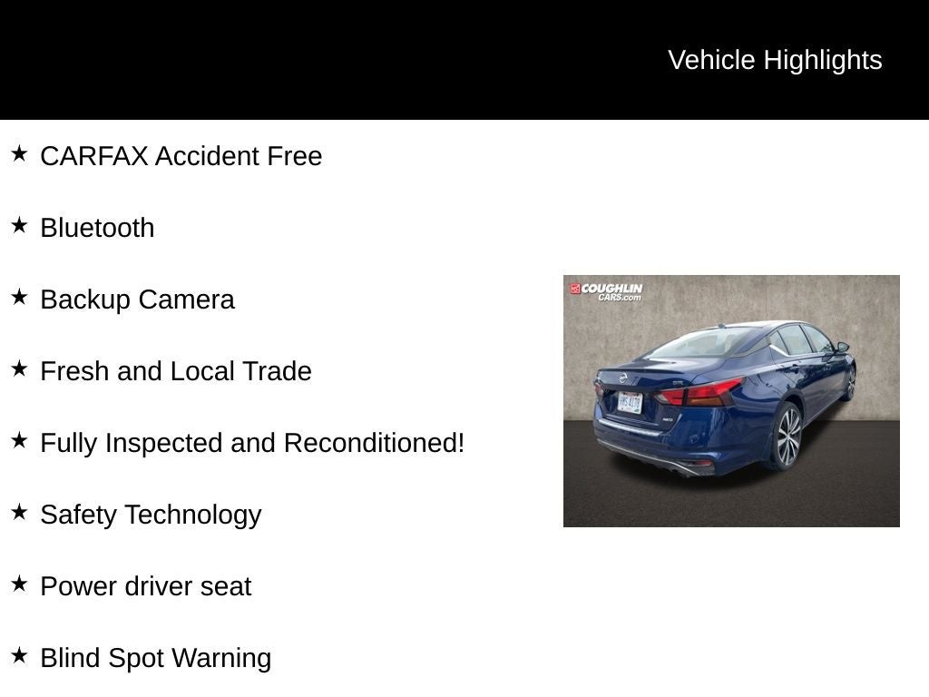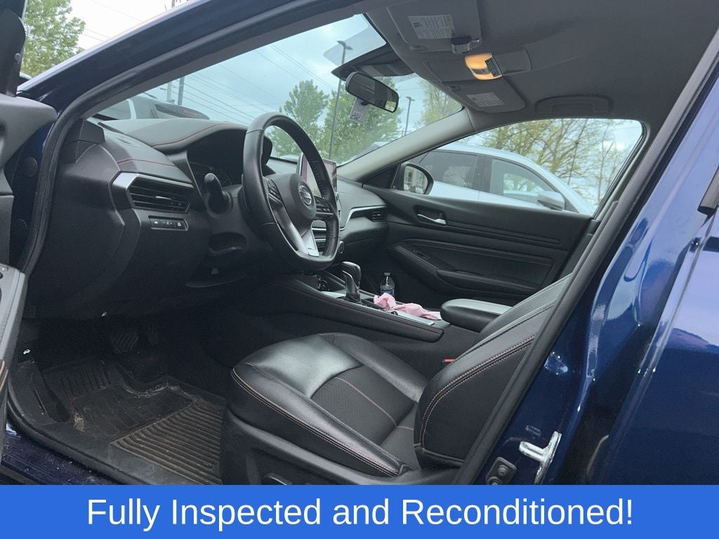 The exterior of this Altima 2.5 SR exudes a sporty and sophisticated style, with a sleek blue paint finish and stylish 19-inch alloy wheels. Step inside and you'll be greeted by a well-appointed cabin featuring premium materials and advanced technology, including a backup camera, Bluetooth® connectivity, and the NissanConnect infotainment system with Apple CarPlay and Android Auto integration.