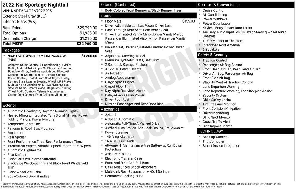 Equipped with Nightfall AWD Premium Package (Additional Rear Floor Console USB Port, Auto-Dimming Rear-View Mirror w/Homelink & Compass, Deluxe Door Scuff, Driver's One-Touch Up/Down Safety Window, Dual Zone Automatic Climate Control, Electronic Parking Brake (EPB), Forward Collision Assist, Heated Front Seats, High Glossy Center Fascia, Leather Shift Knob, LED Rear Combination Lamp, Radio: AM/FM/SiriusXM Audio System, Smart Cruise Control w/Stop & Go, Smart Key w/Push Button Start, Smart Welcome, Unique Front Fascia w/28 Degree Approach Angle, Wheels: 18 Unique Dark Gray, and Wireless Charging Pad), AWD, 4-Wheel Disc Brakes, 6 Speakers, ABS brakes, Air Conditioning, Alloy wheels, AM/FM radio, Apple CarPlay & Android Auto, Auto High-beam Headlights, Axle Ratio: 3.195, Brake assist, Bumpers: body-color, Carpeted Floor Mats, Delay-off headlights, Driver door bin, Driver vanity mirror, Dual front impact airbags, Dual front side impact airbags, Electronic Stability Control, Exterior Parking Camera Rear, Four wheel independent suspension, Front anti-roll bar, Front Bucket Seats, Front Center Armrest, Front fog lights, Front reading lights, Fully automatic headlights, Heated door mirrors, Illuminated entry, Leatherette Seat Trim, Low tire pressure warning, Occupant sensing airbag, Outside temperature display, Overhead airbag, Overhead console, Panic alarm, Passenger door bin, Passenger vanity mirror, Power door mirrors, Power driver seat, Power moonroof, Power steering, Power windows, Radio: AM/FM Audio System, Rear anti-roll bar, Rear seat center armrest, Rear window defroster, Rear window wiper, Remote keyless entry, Roof rack: rails only, Security system, Speed control, Speed-sensing steering, Split folding rear seat, Spoiler, Steering wheel mounted audio controls, Tachometer, Telescoping steering wheel, Tilt steering wheel, Traction control, Trip computer, Turn signal indicator mirrors, Variably intermittent wipers, and Wheels: 18 Dark Gray Alloy.